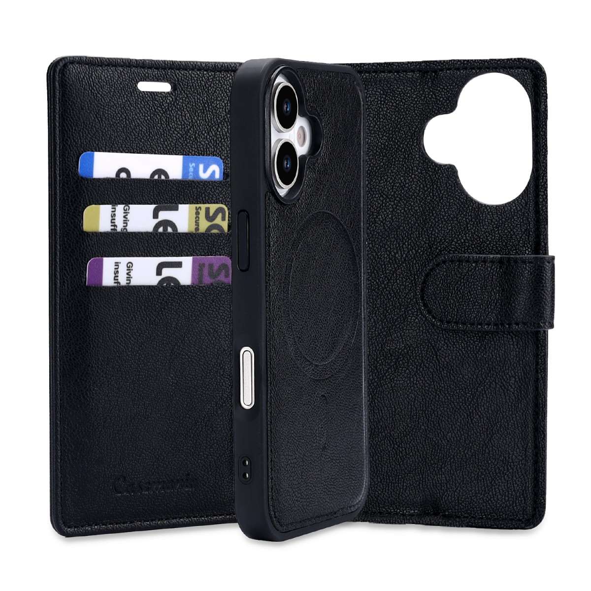 • CaseMania Fine Grain 2-in-1 MagSafe Wallet Case – iPhone 16 – Zwart