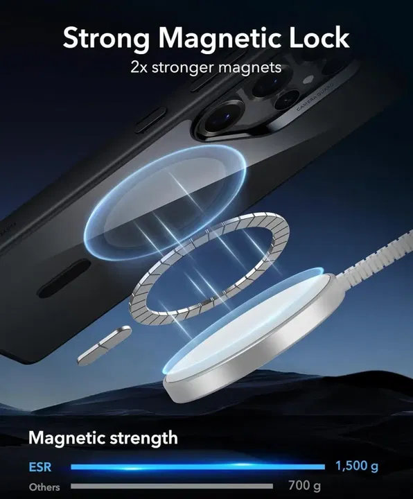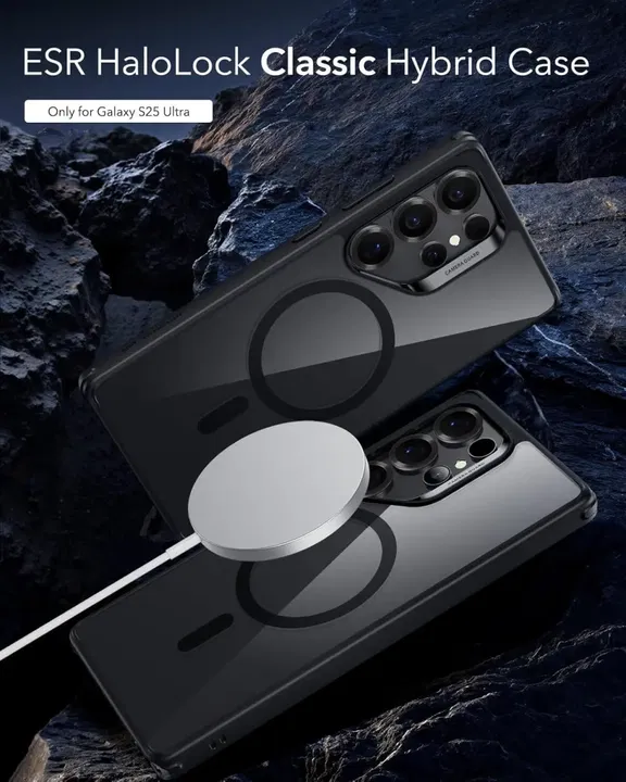 De ESR Hybrid Case is gemaakt van een combinatie van stevig polycarbonaat en schokabsorberend TPU-materiaal. Het harde frame biedt structuur en valbescherming, terwijl het flexibele materiaal schokken opvangt en grip verbetert. De matte afwerking geeft een premium gevoel en houdt vingerafdrukken en krasjes beter verborgen.