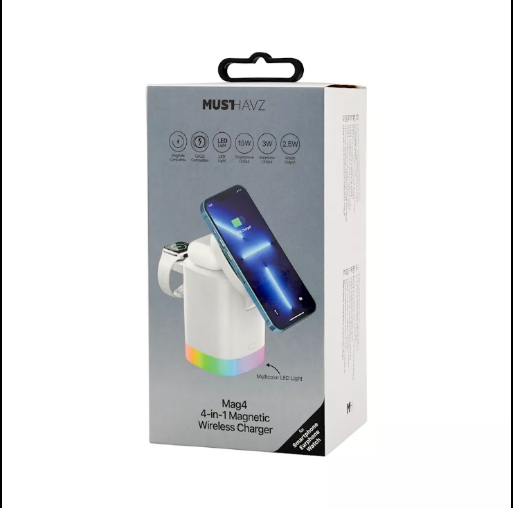 Laad al je apparaten tegelijk op met de Musthavz 4-in-1 Magnetic Wireless Charger. Dit slimme laadstation combineert magnetisch draadloos opladen met een strak en modern ontwerp, zodat je smartphone, smartwatch en oordopjes georganiseerd en efficiënt worden opgeladen. Ideaal voor je bureau of nachtkastje zonder losse kabels.