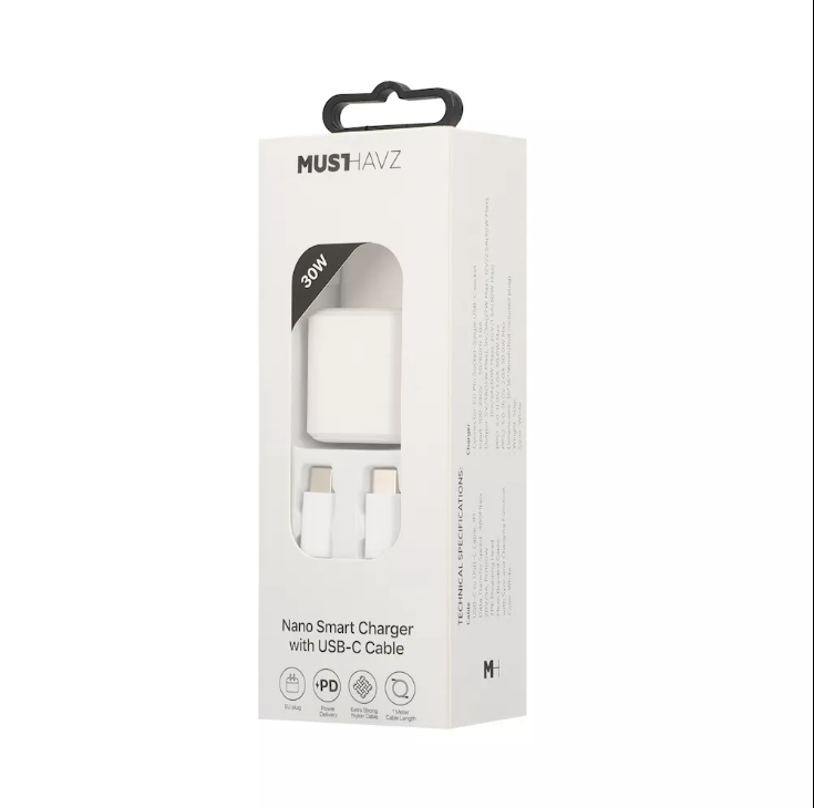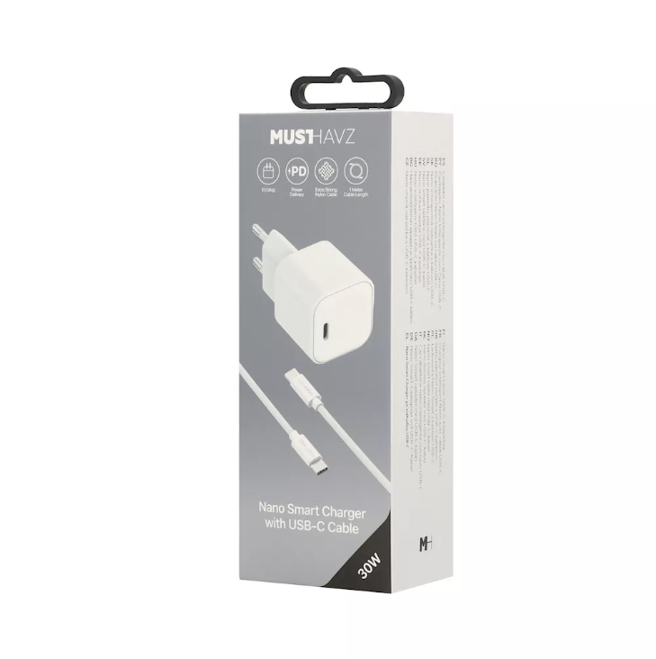 De Musthavz Nano Charger 30W met USB-C naar USB-C kabel in het wit is een krachtige en compacte oplader voor je smartphone, tablet of andere USB-C apparaten. Dankzij het vermogen van 30W laad je je apparaten snel en efficiënt op.