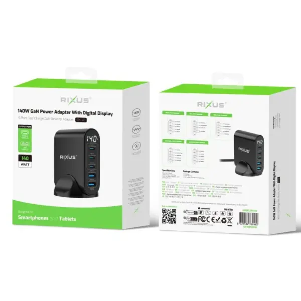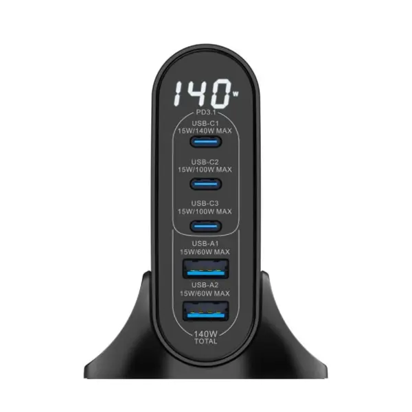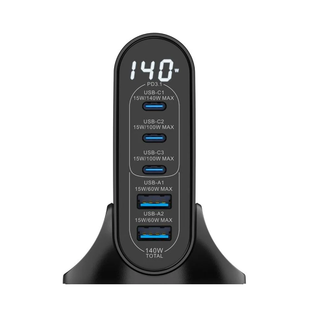 5 Poorts snellader 140W GaN Power Adapter met digitaal display